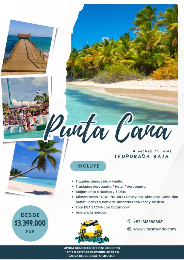 ¿Estás listo para vivir la experiencia caribeña? Desde Colombia a Punta Cana, Vibra Mundo te lleva a las mejores playas de República Dominicana. 🌞 5 días y 4 noches en hoteles all-inclusive frente al mar. 🍽 Todo incluido: desayuno, almuerzo, cena y bebidas ilimitadas. 🏖 Actividades acuáticas y deportivas para toda la familia. 💃 Disfruta de shows en vivo y fiestas temáticas.